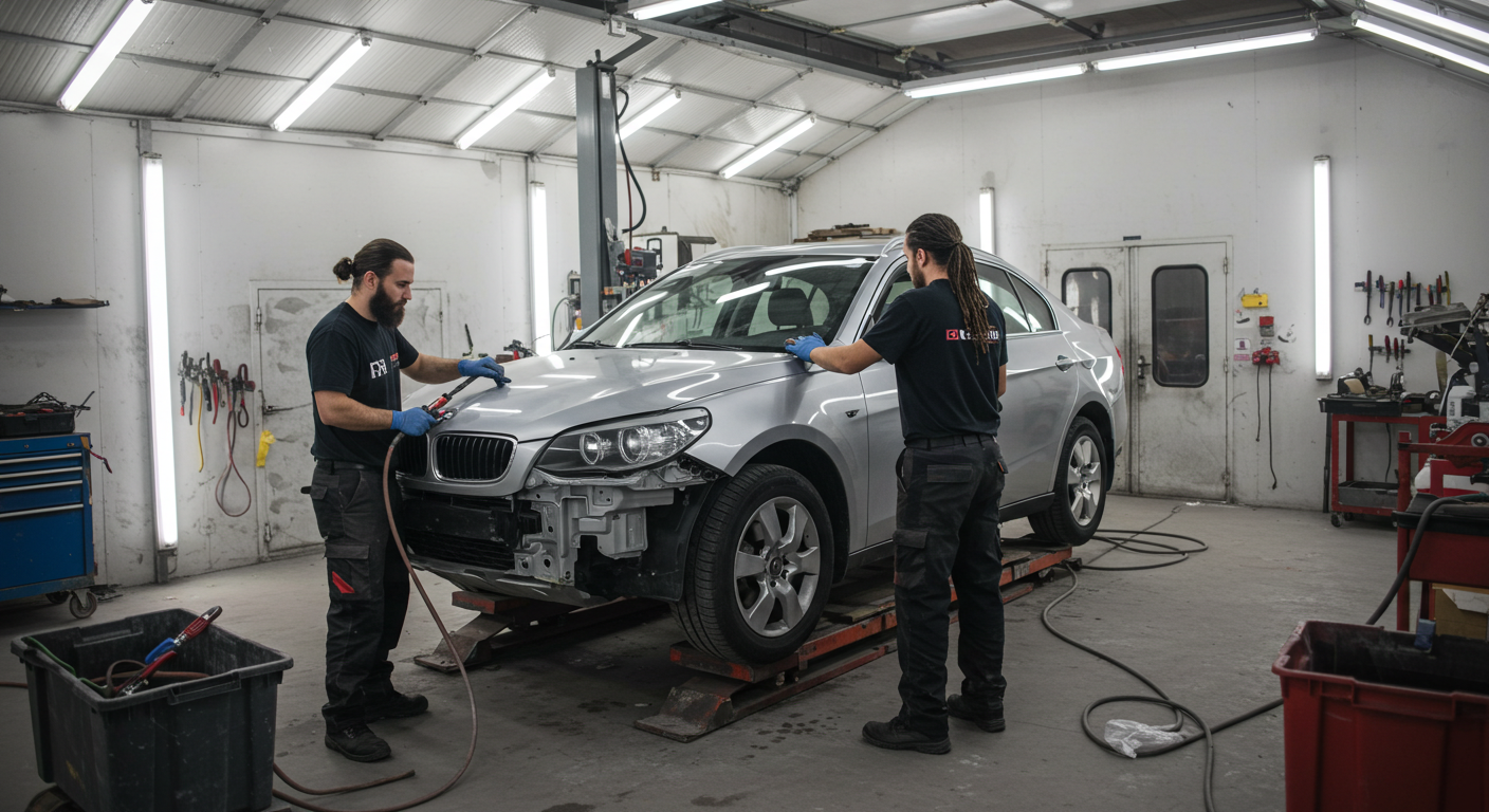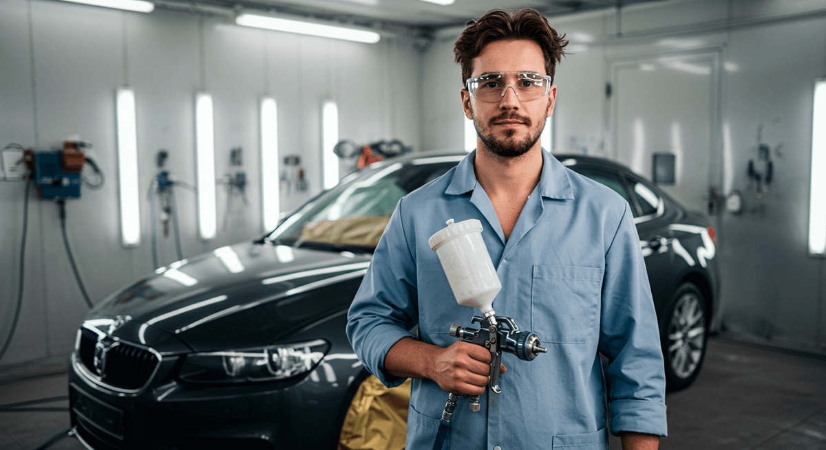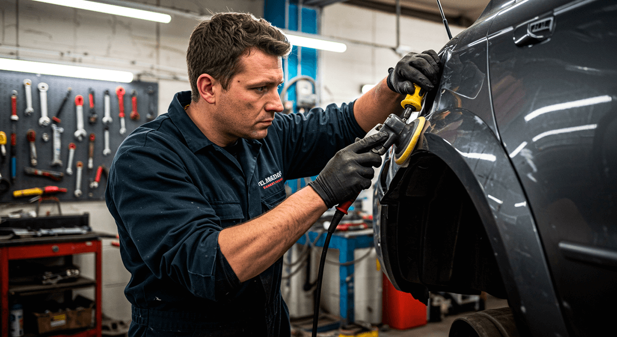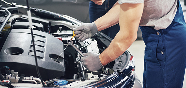 Mid-section of mechanic holding wrench tool in repair garage